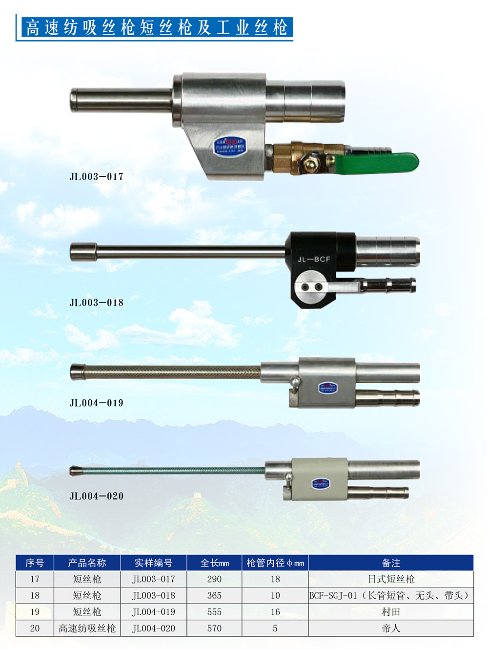 主營(yíng)各種系列吸絲槍和各種規(guī)格快速插座、升絲拉桿為主。吸絲槍主要包括高速紡FDY、 POY、短絲槍、工業(yè)絲槍,包括紡DTY、加彈機(jī)系列。來(lái)圖來(lái)樣生產(chǎn)。